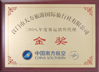 中國南方航空頒發(fā)的 2008年度客運(yùn)銷售代理“金獎(jiǎng)” |