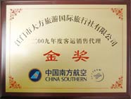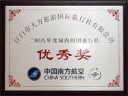 中國南方航空頒發(fā)的 2008年度國內(nèi)組團(tuán)旅行社“優(yōu)秀獎(jiǎng)” |