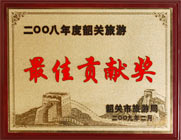 韶關(guān)市旅游局頒發(fā)的 2008年度韶關(guān)旅游“最佳貢獻(xiàn)獎(jiǎng)” |