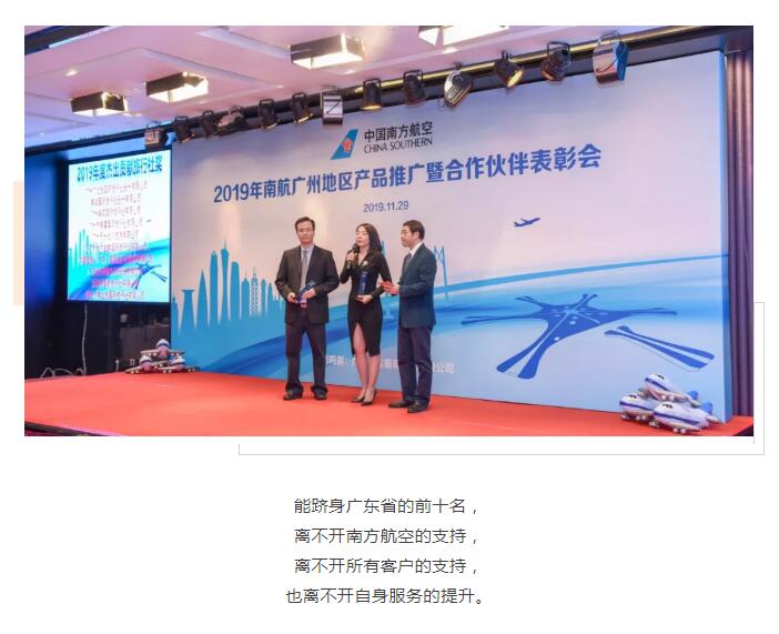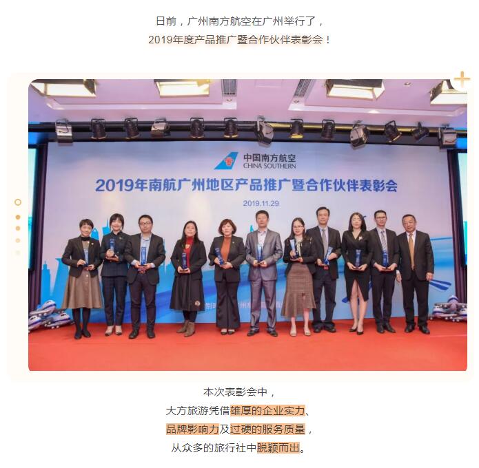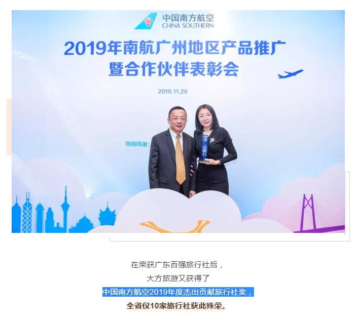 熱烈祝賀大方旅游獲得“中國(guó)南方航空2019年度杰出貢獻(xiàn)旅行社”的殊榮
