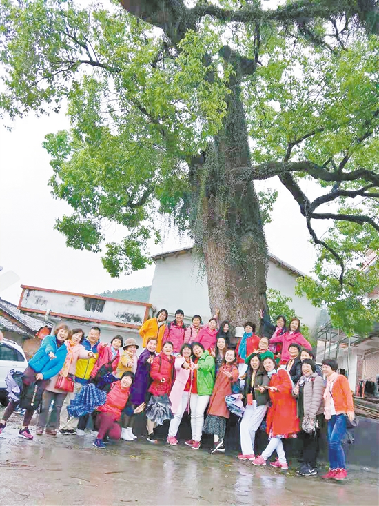 參觀完文化館,雨越下越大,可團友們游覽的熱情依然高漲,大家一致希望按照行程前往永樂村參觀。永樂村是一個建于明朝之前的客家古村落,后因避諱明朝“永樂”年號,改名劉屋村。之后,又復名永樂村。村中有一棵高18米、直徑1.8米,種植于明朝嘉靖年間,樹齡超500年的古樟樹。樹木根深葉茂,偉岸壯觀,與旁邊一棵約250年歷史的古樟樹合稱“父子樹”。天公作美,到永樂村時,雨就停了。團友們都興奮地跑去與超500年樹齡的古樟樹拍照合影,并全員大合唱,大家都表示玩得非常開心。