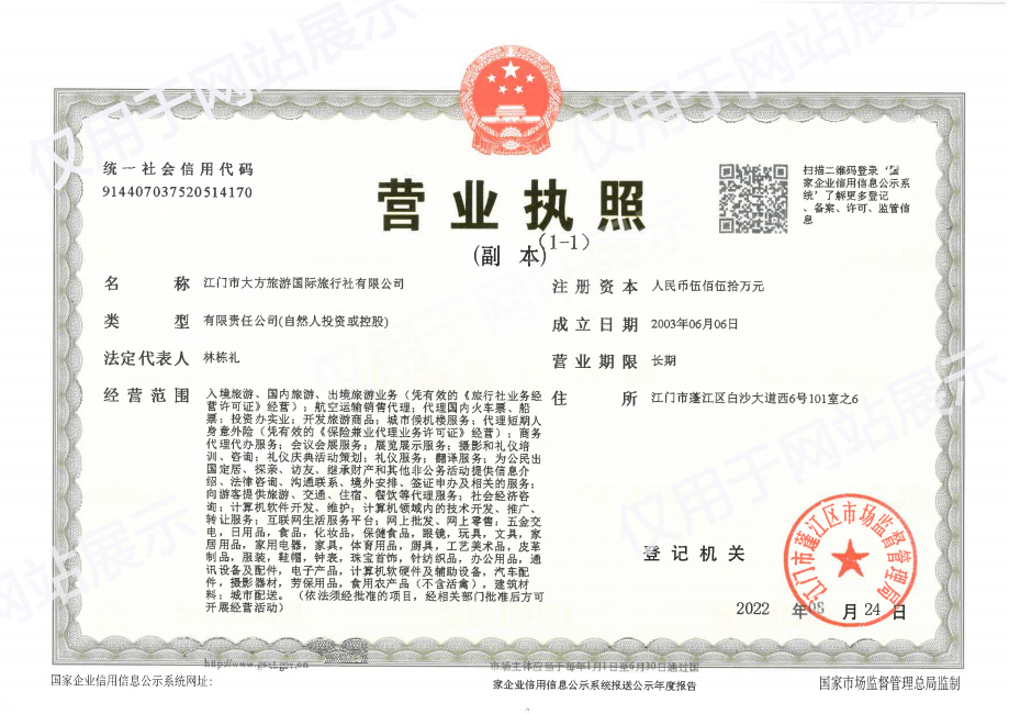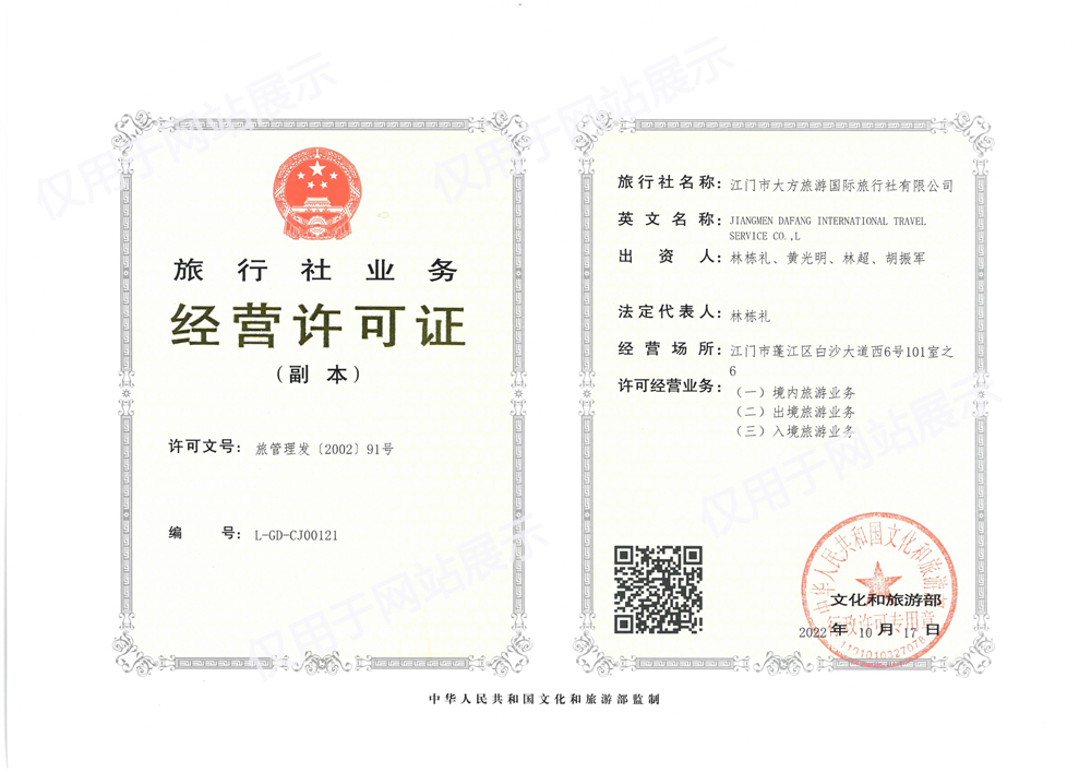 旅行社的名稱:江門市大方旅游國際旅行社有限公司