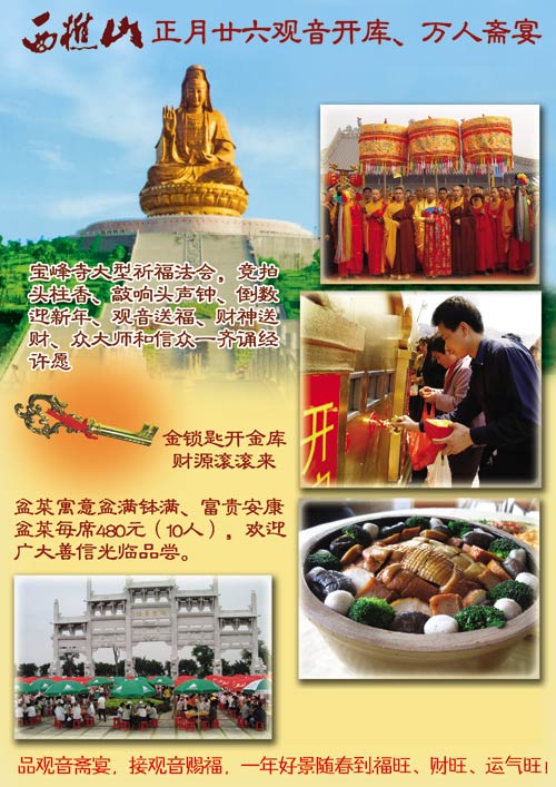 農(nóng)歷正月廿六(陽(yáng)歷2月20日)是西樵山延續(xù)了上千年的觀音借庫(kù)日,在活動(dòng)期間,西樵山將舉行“向觀音借庫(kù)、抗金融海嘯”為主題的借庫(kù)活動(dòng),游客來(lái)到西樵山,點(diǎn)燃香燭,虔誠(chéng)地參拜完觀音菩薩后,用金光閃閃的鑰匙打開(kāi)金庫(kù),取出菩薩開(kāi)的支票和開(kāi)過(guò)光的觀音鍍金像。借完庫(kù)后還可以接觀音圣水、貼觀音金鉑。美麗傳說(shuō):觀音開(kāi)庫(kù)延續(xù)千年。 西樵山關(guān)于農(nóng)歷正月廿六觀音開(kāi)庫(kù)的傳說(shuō)已經(jīng)有上千年的歷史了。“當(dāng)發(fā)菩提心,廣濟(jì)諸群生”。傳說(shuō)有一年大旱,西樵山上百姓幾乎顆粒無(wú)收。年后,家家戶戶斷糧停炊。正在百姓饑寒交迫之際,正月廿六日,西樵山來(lái)了一位美麗的姑娘。她背著一個(gè)不大的米袋和錢(qián)袋,逐家逐戶派米、派錢(qián),救濟(jì)百姓。救濟(jì)完百姓后,已經(jīng)是黃昏時(shí)分,女子面帶微笑,變成一位法相莊嚴(yán)的菩薩合掌微笑。大家這時(shí)候才明白這名美麗女子是觀世音菩薩化身,前來(lái)救苦救難。